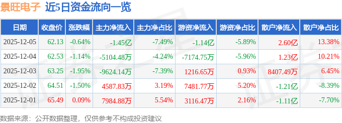 证券之星消息,截至2025年12月5日收盘,景旺电子(603228)报收于62.13元,下跌0.64%,换手率3.25%,成交量31.74万手,成交额19.41亿元。