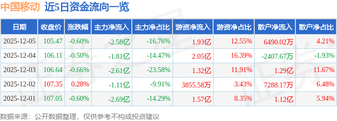 证券之星消息,截至2025年12月5日收盘,中国移动(600941)报收于105.47元,下跌0.6%,换手率1.62%,成交量14.6万手,成交额15.4亿元。