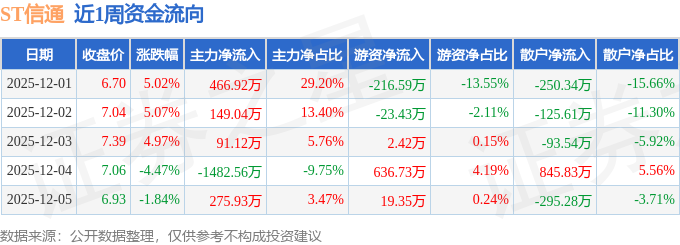 资金流向数据方面,本周ST信通主力资金合计净流出499.56万元,游资资金合计净流入418.49万元,散户资金合计净流入81.07万元。本周资金流向一览见下表: