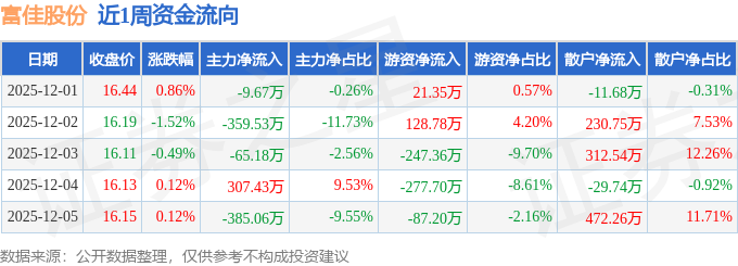 资金流向数据方面,本周富佳股份主力资金合计净流出512.0万元,游资资金合计净流出462.13万元,散户资金合计净流入974.13万元。本周资金流向一览见下表: