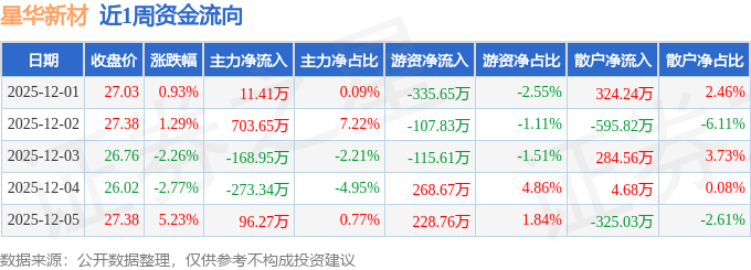 资金流向数据方面,本周星华新材主力资金合计净流入369.04万元,游资资金合计净流出61.67万元,散户资金合计净流出307.37万元。本周资金流向一览见下表: