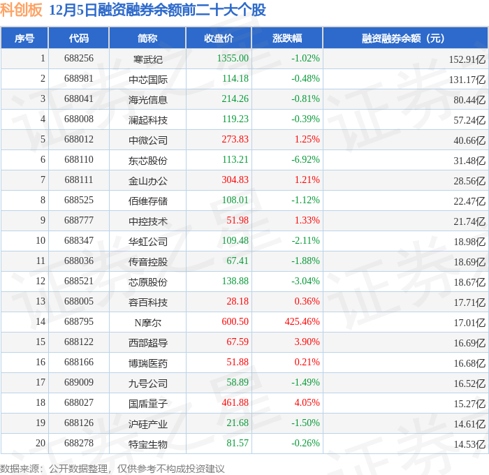 科创板融资融券余额前三分别为:寒武纪(688256)融资融券余额152.91亿元、中芯国际(688981)融资融券余额131.17亿元、海光信息(688041)融资融券余额80.44亿元,前20具体见下表: