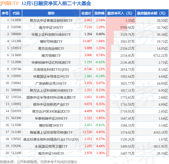 沪深ETF融资净买入前三分别为:易方达中证香港证券投资ETF(513090)融资净买入1.35亿元、南方中证500ETF(510500)融资净买入9709.66万元、华夏上证科创板50成份ETF(588000)融资净买入3529.76万元,前20具体见下表: