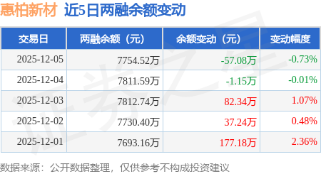 证券之星消息,12月5日,惠柏新材(301555)融资买入273.48万元,融资偿还330.55万元,融资净卖出57.08万元,融资余额7754.52万元。