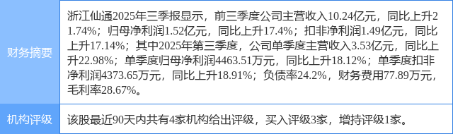 2025年9月30日,上海证券研究员仇百良发布了对浙江仙通的研报《布局机器人业务,自主密封条龙头再启航》,该研报对浙江仙通给出“买入”评级。研报中预计公司2025-2027年归母净利润分别为2.18、2.66、3.22亿元,同比分别+27.10%、+22.06%、+20.93%。2025年9月29日收盘价对应PE分别为26.11x、21.39x、17.69x。维持“买入”评级。证券之星数据中心根据近三年发布的研报数据计算,该研报作者对此股的盈利预测准确度为71.95%。
