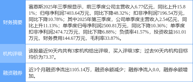 2025年11月1日,东吴证券研究员袁理,谷玥发布了对赛恩斯的研报《2025年三季报点评:业绩受累于费用&减值,拟发行可转债扩产药剂》,该研报对赛恩斯给出“买入”评级。证券之星数据中心根据近三年发布的研报数据计算,该研报作者对此股的盈利预测准确度为81.15%。