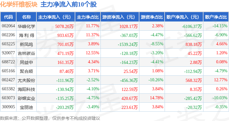 从资金流向上来看,当日化学纤维板块主力资金净流出5130.72万元,游资资金净流入5692.09万元,散户资金净流出561.37万元。化学纤维板块个股资金流向见下表: