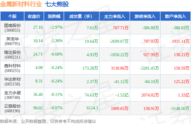 个股表现方面,金属新材料行业当日领跌股为图南股份(300855),该股当日报收27.16,下跌2.97%,成交量7.61万,主力资金净流入767.71万元。英洛华(000795)以下跌1.36%紧随其后,该股当日成交量19.64万,主力资金净流出2699.07万元。除此之外,隆达股份(688231)、鑫科材料(600255)、华达新材(605158)均进入当日熊股之列。具体个股列表见下表: