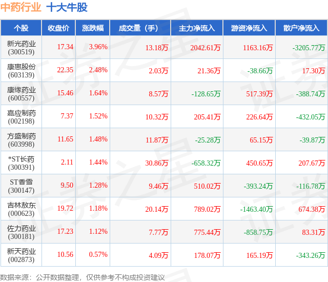 个股表现方面,中药行业当日领涨股为新光药业(300519),该股当日报收17.34,上涨3.96%,成交量13.18万,主力资金净流入2042.61万元。康惠股份(603139)以上涨2.48%紧随其后,该股当日成交量2.03万,主力资金净流入21.36万元。除此之外,康缘药业(600557)、嘉应制药(002198)、方盛制药(603998)均进入当日牛股之列。具体个股列表见下表: