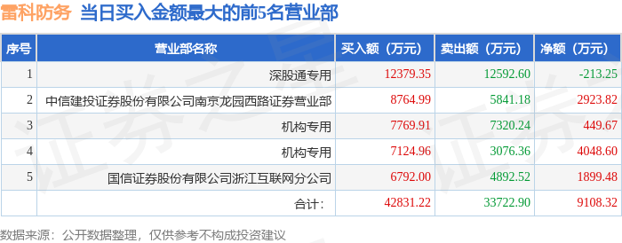 证券之星消息,沪深交易所2025年12月8日公布的交易公开信息显示,雷科防务(002413)因日换手率达到20%的前5只证券登上龙虎榜。此次是近5个交易日内第4次上榜。