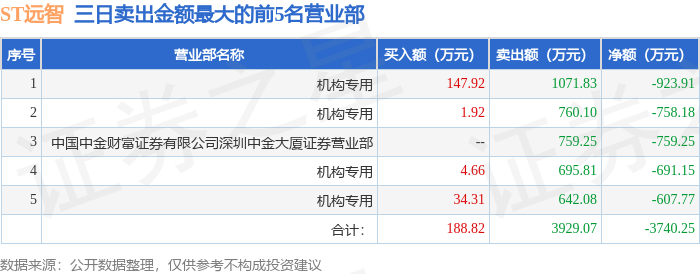 证券之星消息,沪深交易所2025年12月8日公布的交易公开信息显示,ST远智(002689)因连续三个交易日内,跌幅偏离值累计达到12%的ST证券、*ST证券和未完成股改证券登上龙虎榜。此次是近5个交易日内第2次上榜。