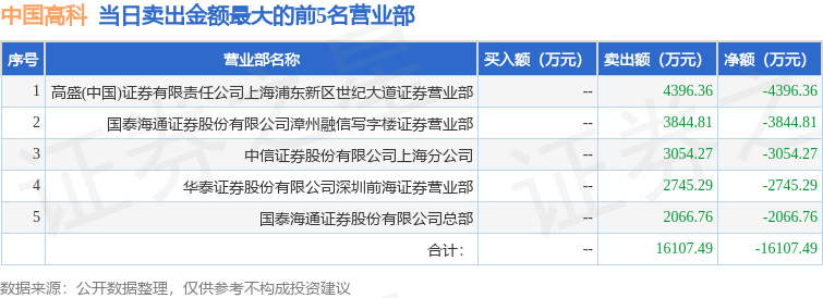 证券之星消息,沪深交易所2025年12月8日公布的交易公开信息显示,中国高科(600730)因有价格涨跌幅限制的日收盘价格跌幅偏离值达到7%的前五只证券登上龙虎榜。此次是近5个交易日内第1次上榜。