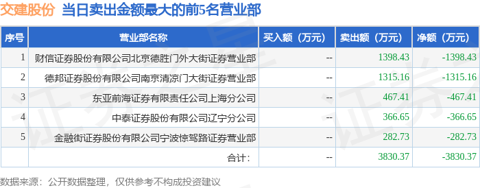 证券之星消息,沪深交易所2025年12月8日公布的交易公开信息显示,交建股份(603815)因有价格涨跌幅限制的日收盘价格跌幅偏离值达到7%的前五只证券登上龙虎榜。此次是近5个交易日内第1次上榜。
