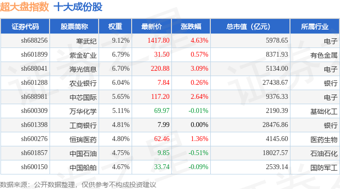 证券之星消息,12月8日,超大盘(000043)指数报收于2614.47点,涨0.88%,成交738.07亿元,换手率0.19%。当日该指数成份股中,上涨的有9家,寒武纪以4.63%的涨幅领涨,下跌的有10家,中国神华以1.52%的跌幅领跌。