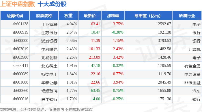 证券之星消息,12月8日,上证中盘(000044)指数报收于4530.65点,涨0.38%,成交1301.65亿元,换手率0.76%。当日该指数成份股中,上涨的有53家,兴业证券以6.94%的涨幅领涨,下跌的有69家,石头科技以3.19%的跌幅领跌。