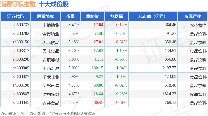 证券之星消息,12月8日,消费等权(000074)指数报收于7131.9点,跌0.46%,成交114.47亿元,换手率0.62%。当日该指数成份股中,上涨的有10家,丸美生物以1.31%的涨幅领涨,下跌的有19家,千禾味业以1.6%的跌幅领跌。