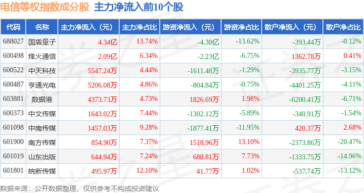 资金流向方面,电信等权(000078)指数成份股当日主力资金净流出合计1.58亿元,游资资金净流出合计5.67亿元,散户资金净流入合计7.25亿元。成份股资金流向详情见下表: