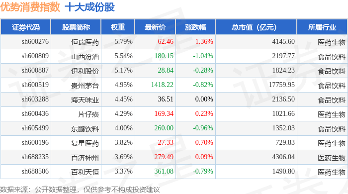 证券之星消息,12月8日,优势消费(000147)指数报收于6844.32点,跌0.21%,成交188.78亿元,换手率0.73%。当日该指数成份股中,上涨的有16家,恒瑞医药以1.36%的涨幅领涨,下跌的有27家,千禾味业以1.6%的跌幅领跌。
