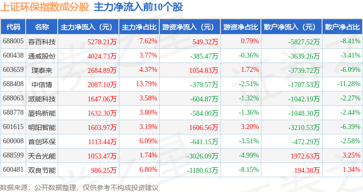 资金流向方面,上证环保(000158)指数成份股当日主力资金净流出合计3.85亿元,游资资金净流入合计1.95亿元,散户资金净流入合计1.91亿元。成份股资金流向详情见下表: