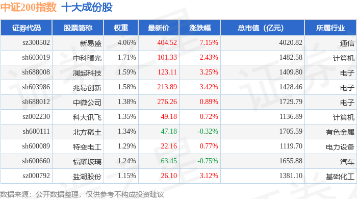 中证200(000904)指数十大成份股详情如下: