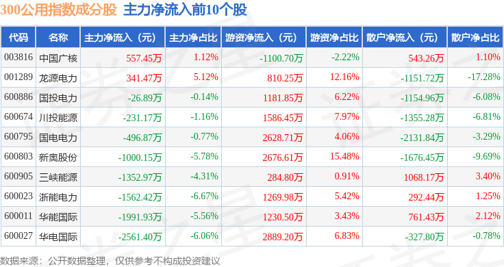 资金流向方面,300公用(000917)指数成份股当日主力资金净流出合计2.51亿元,游资资金净流入合计2.4亿元,散户资金净流入合计1065.28万元。成份股资金流向详情见下表: