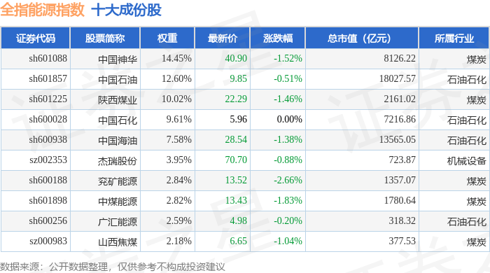 全指能源(000986)指数十大成份股详情如下: