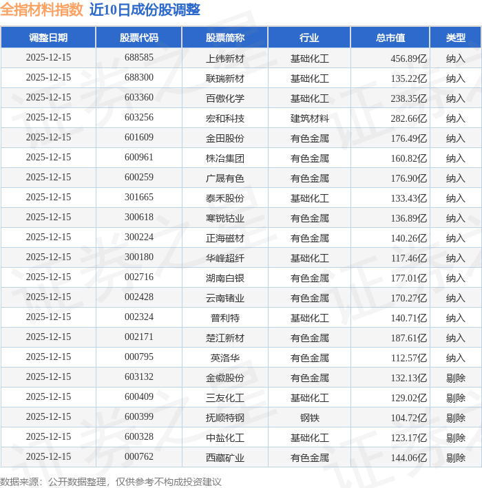 近10日内全指材料(000987)指数成份股做了调整,新纳入了16只股票,剔除了5只股票。