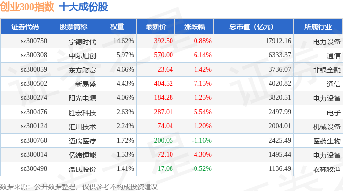创业300(399012)指数十大成份股详情如下: