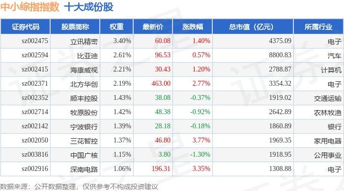 中小综指(399101)指数十大成份股详情如下:
