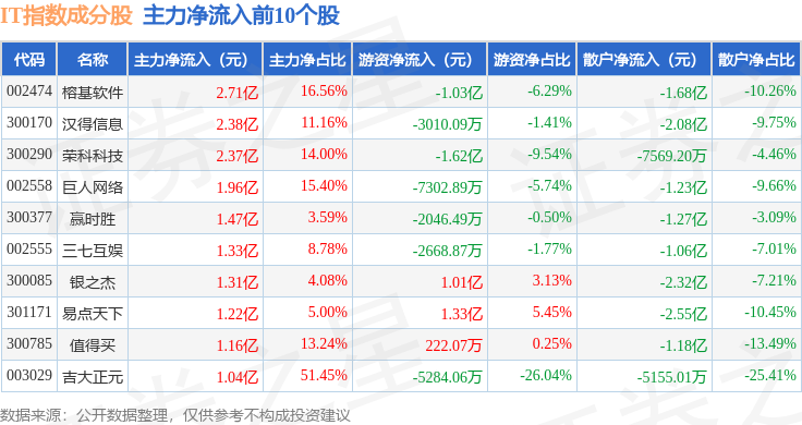 资金流向方面,IT指数(399239)成份股当日主力资金净流入合计7.14亿元,游资资金净流出合计6.35亿元,散户资金净流出合计7893.84万元。成份股资金流向详情见下表: