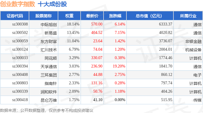 证券之星消息,12月8日,创业数字(399263)指数报收于3243.7点,涨4.12%,成交1437.87亿元,换手率4.15%。当日该指数成份股中,上涨的有43家,天孚通信以19.2%的涨幅领涨,下跌的有3家,华测导航以0.53%的跌幅领跌。