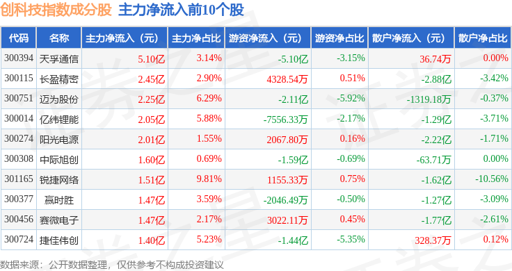 资金流向方面,创科技(399276)指数成份股当日主力资金净流入合计17.08亿元,游资资金净流出合计7.93亿元,散户资金净流出合计9.15亿元。成份股资金流向详情见下表:
