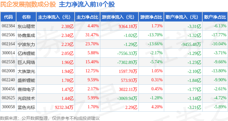 资金流向方面,民企发展(399292)指数成份股当日主力资金净流出合计9.17亿元,游资资金净流入合计3.03亿元,散户资金净流入合计6.13亿元。成份股资金流向详情见下表: