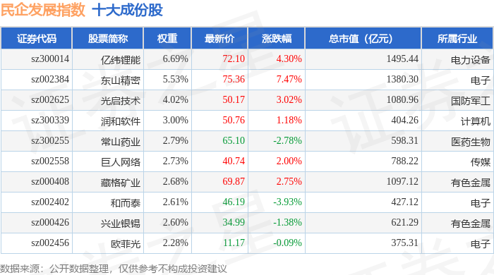 民企发展(399292)指数十大成份股详情如下: