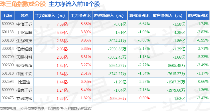 资金流向方面,珠三角(399356)指数成份股当日主力资金净流入合计21.34亿元,游资资金净流出合计11.29亿元,散户资金净流出合计10.05亿元。成份股资金流向详情见下表: