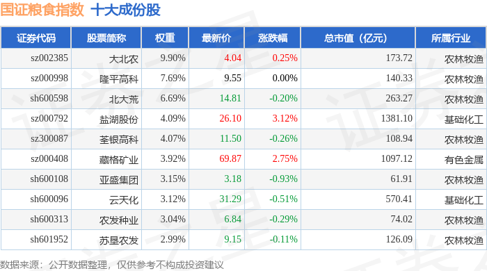 近10日内国证粮食(399365)指数成份股做了调整,新纳入了5只股票。