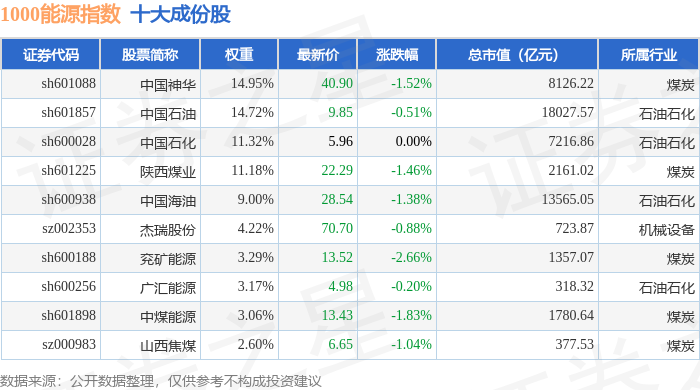 1000能源(399381)指数十大成份股详情如下: