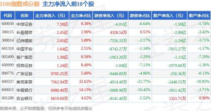 资金流向方面,I100(399415)指数成份股当日主力资金净流入合计6.56亿元,游资资金净流出合计8.08亿元,散户资金净流入合计1.52亿元。成份股资金流向详情见下表: