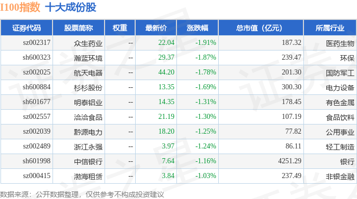 I100(399415)指数十大成份股详情如下: