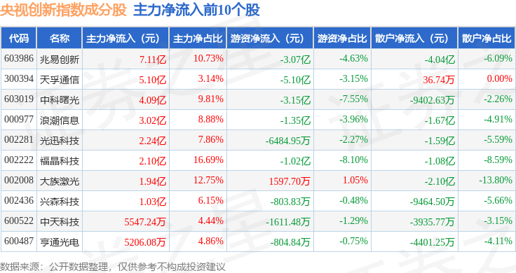 资金流向方面,央视创新(399551)指数成份股当日主力资金净流入合计15.36亿元,游资资金净流出合计8.61亿元,散户资金净流出合计6.75亿元。成份股资金流向详情见下表: