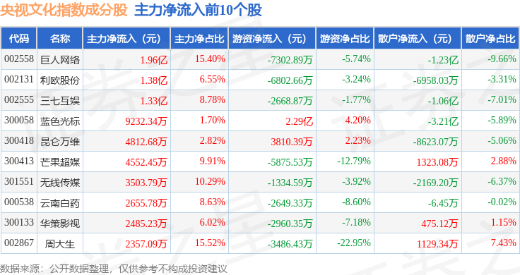 资金流向方面,央视文化(399557)指数成份股当日主力资金净流出合计3.18亿元,游资资金净流入合计2.79亿元,散户资金净流入合计3876.4万元。成份股资金流向详情见下表:
