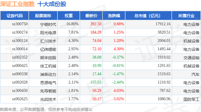 证券之星消息,12月8日,深证工业(399615)指数报收于4163.86点,涨1.25%,成交1428.55亿元,换手率2.28%。当日该指数成份股中,上涨的有97家,迈为股份以17.47%的涨幅领涨,下跌的有60家,思源电气以2.44%的跌幅领跌。