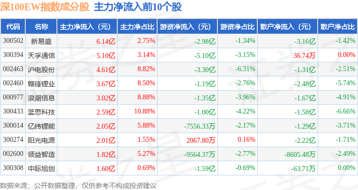 资金流向方面,深100EW(399632)指数成份股当日主力资金净流入合计5.15亿元,游资资金净流出合计5.31亿元,散户资金净流入合计1614.99万元。成份股资金流向详情见下表: