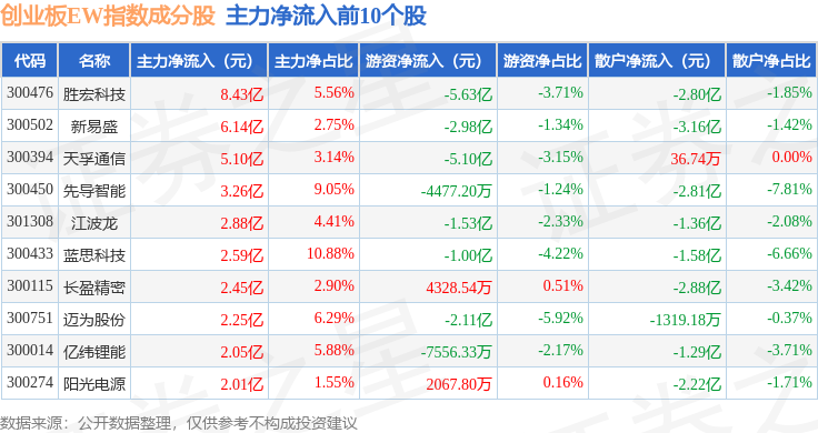 资金流向方面,创业板EW(399635)指数成份股当日主力资金净流入合计39.15亿元,游资资金净流出合计12.13亿元,散户资金净流出合计27.03亿元。成份股资金流向详情见下表:
