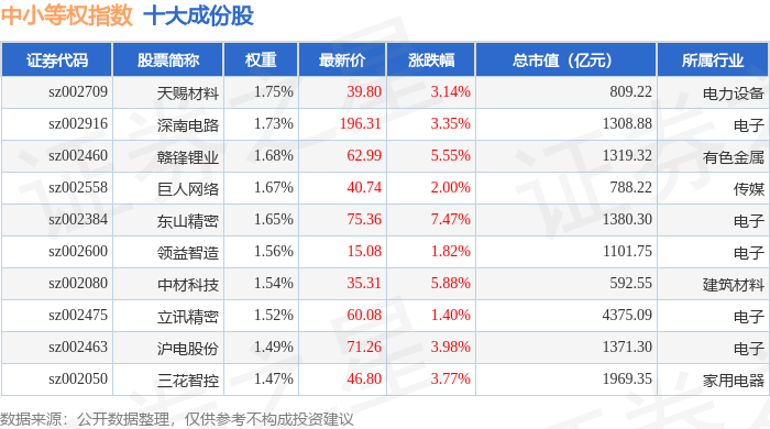 证券之星消息,12月8日,中小等权(399634)指数报收于4199.33点,涨1.07%,成交1162.07亿元,换手率1.36%。当日该指数成份股中,上涨的有55家,东山精密以7.47%的涨幅领涨,下跌的有44家,思源电气以2.44%的跌幅领跌。