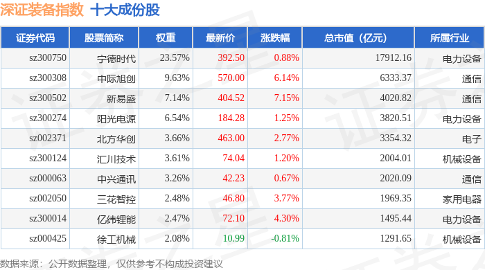 证券之星消息,12月8日,深证装备(399636)指数报收于8109.75点,涨2.36%,成交1790.16亿元,换手率3.11%。当日该指数成份股中,上涨的有55家,锐捷网络以11.23%的涨幅领涨,下跌的有25家,思源电气以2.44%的跌幅领跌。