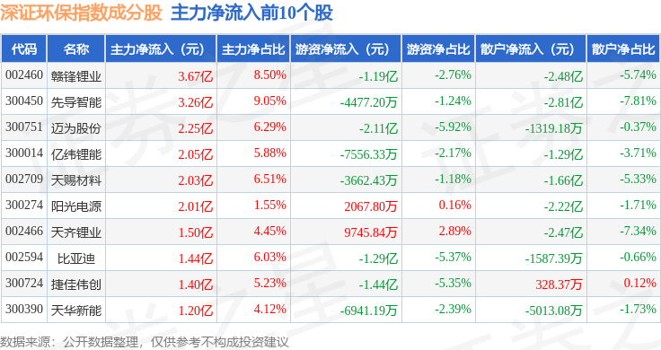 资金流向方面,深证环保(399638)指数成份股当日主力资金净流入合计21.54亿元,游资资金净流出合计6.5亿元,散户资金净流出合计15.05亿元。成份股资金流向详情见下表: