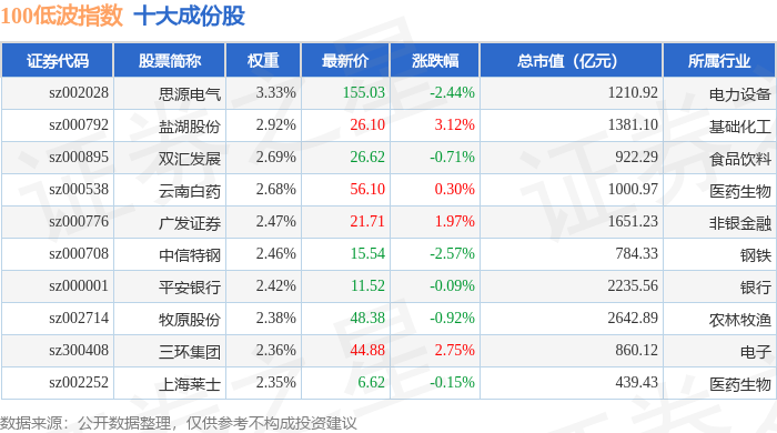证券之星消息,12月8日,100低波(399645)指数报收于9409.2点,跌0.3%,成交443.88亿元,换手率1.0%。当日该指数成份股中,上涨的有15家,盐湖股份以3.12%的涨幅领涨,下跌的有35家,中信特钢以2.57%的跌幅领跌。