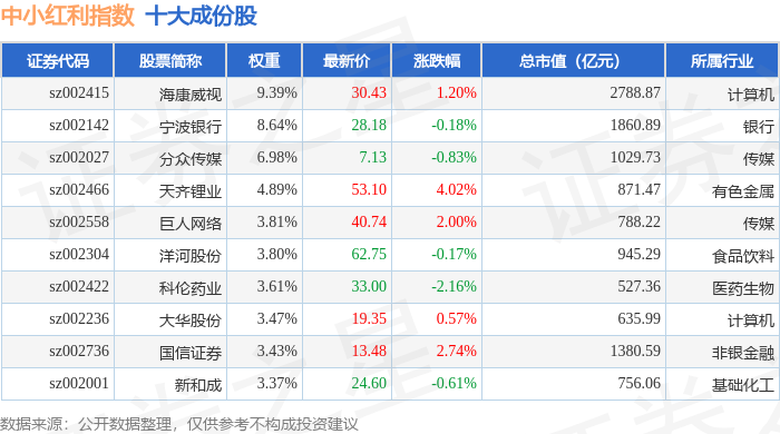 证券之星消息,12月8日,中小红利(399649)指数报收于3192.76点,涨0.51%,成交265.77亿元,换手率0.99%。当日该指数成份股中,上涨的有19家,中材科技以5.88%的涨幅领涨,下跌的有29家,华峰化学以2.38%的跌幅领跌。