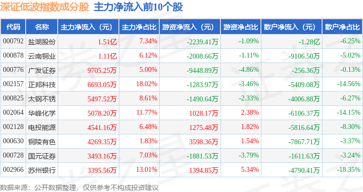 资金流向方面,深证低波(399661)指数成份股当日主力资金净流出合计17.33亿元,游资资金净流入合计7.04亿元,散户资金净流入合计10.28亿元。成份股资金流向详情见下表: